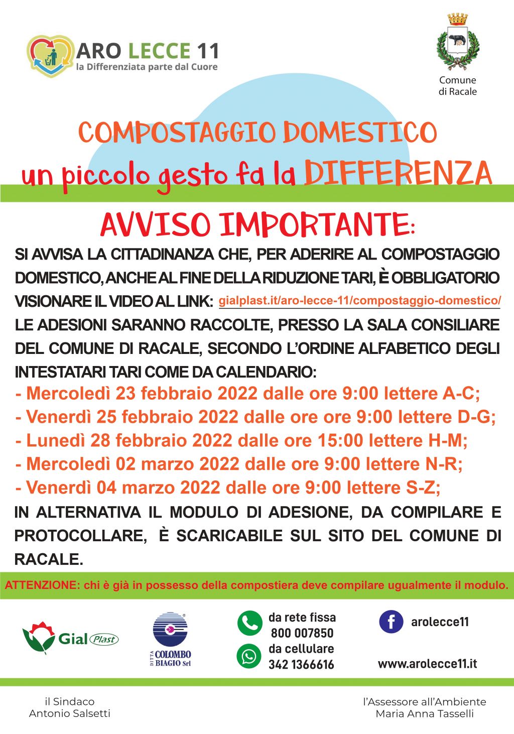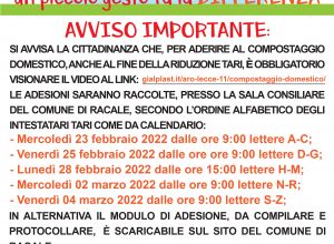Si avvisa la cittadinanza che, per aderire al compostaggio domestico, anche al fine della riduzione TARI, è obbligatorio visionare il video al link: https://gialplast.it/aro-lecce-11/compostaggio-domestico/